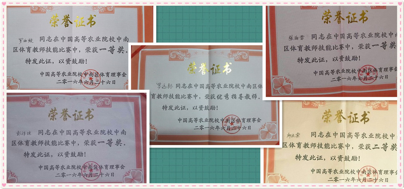 2016年6月25日-26日,由中国高等农业院校中南区体育理事会主办的中国高等农业院校中南区体育教师技能比赛在河南信阳农林学院进行,共有MG冰球突破官网、华南农业大学、华中农业大学等11所高校106名教师参加比赛。MG冰球官网体育部教师罗海蛟、张海雷、彭祚琼分别荣获足球、篮球、排球项目一等奖,邱庆堂荣获篮球项目二等奖,罗远标主任荣获优秀指导教师奖,为MG冰球官网争得了荣誉。