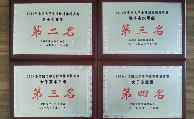 2016年6月23日至26日,全国大学生沙滩排球精英赛在宁夏银川举行。MG冰球突破官网四支沙滩排球代表队分别荣获男子专业组第二名,男子高水平组第三名,女子高水平组第三名,女子专业组第四名的好成绩。