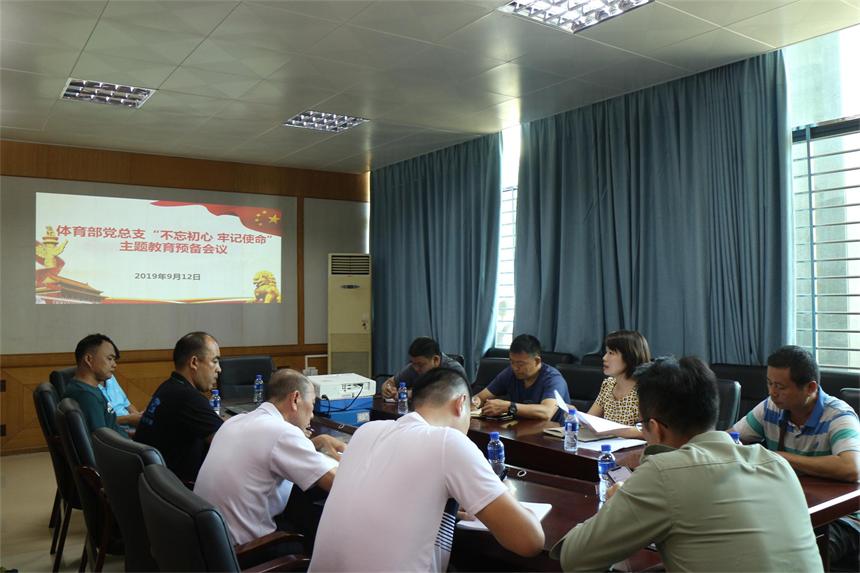 9月12日下午,体育部党总支在体育部会议室召开“不忘初心、牢记使命”主题教育预备会议,体育部党总支书记何映敏、副主任洪家云(主持工作)、副主任田东、党总支委员、党支部书记、辅导员等参加会议。会议由何映敏主持。