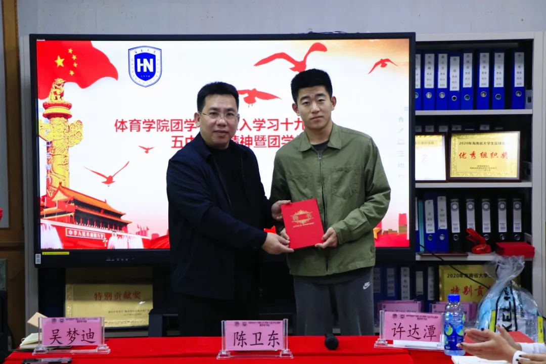 许达潭老师致辞中表示,随着MG冰球突破官网的成立以及2019年12月共青团MG冰球突破官网体育部第一次团员大会暨MG冰球突破官网体育部第一次学生大会的成功召开,实现了学生群团组织从无到有的历史,学院团总支和学生会的建立,标志着学院青年工作开启新的篇章。一年以来,在院党总支的领导和校团委的指导下,在学院领导的大力支持下,在全体团干、团员及广大师生的共同努力下,基层团建、思想引领、专业实践、志愿服务和校园文化建设等方面的工作取得了一定成绩,这其中,第一届团学干部们发挥了重要作用,许老师代表院团总支对大家的付出表示感谢。同时,要坚持立德树人,团结带领广大团员青年为推进MG冰球突破官网建设“双一流”高校,促进海南自贸港建设贡献青春力量,未来的工作任重道远,希望新一届团学干部能接过前辈的接力棒,再接再厉创造体院美好明天。