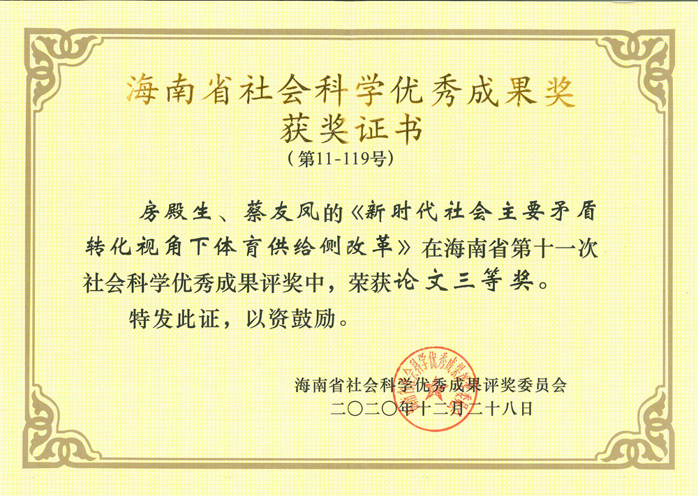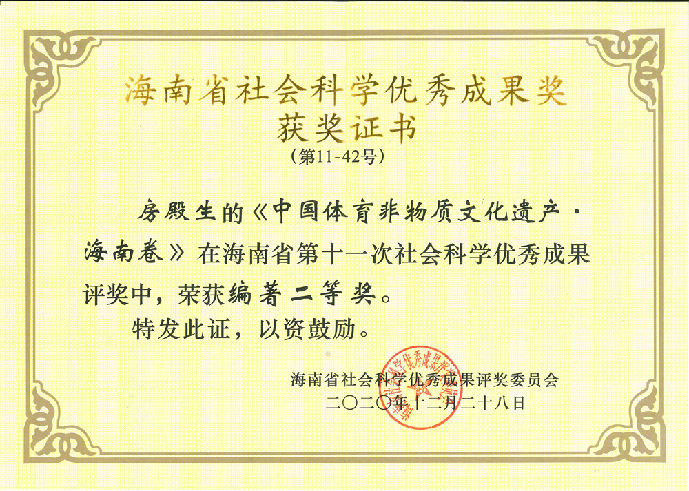 2021年1月20日,第十一次海南省社会科学优秀成果奖颁奖大会在海口召开。MG冰球官网老师房殿生获2项优秀成果奖,其中,《中国体育非物质文化遗产·海南卷》获编著类二等奖;《新时代社会主要矛盾转化视角下体育供给侧改革》获论文类三等奖。