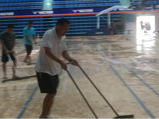 学院安排吴强副院长等三人在学院值班。台风期间,体育馆地下室出现积水,严重危及体育馆空调、机房等大型设备的安全。在这危急时刻,陈卫东书记和洪家云院长果断指示,吴强副院长带领值班人员克服重重困难,充分利用备用发电机及抽水机,轮流值班抽出地下室积水,为保护学校财产立下汗马功劳。