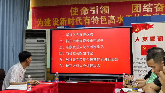 会议第一项,讨论、投票、表决杜金同志由预备党员转为正式党员的决议。按照“举行入党宣誓仪式、转正对象宣读转正申请、考察联系人发表考察意见、与会党员酝酿讨论、对预备党员能否按期转正进行表决、转正人对大会进行表态”六个步骤进行。首先由第三支部书记肖国良同志带领杜金同志进行庄严的入党宣誓仪式;接着杜金同志郑重宣读转正申请;考察联系人高子岩及彭祚琼两位同志就杜金一年来的工作、生活等情况发表考察意见;第三支部副书记吴钟权、院长洪家云、副院长房殿生几位同志肯定了杜金一年来的工作表现、鼓励其再接再厉、积极践行;最后与会的全体党员一致举手表决通过杜金同志由预备党员转为正式党员的申请。