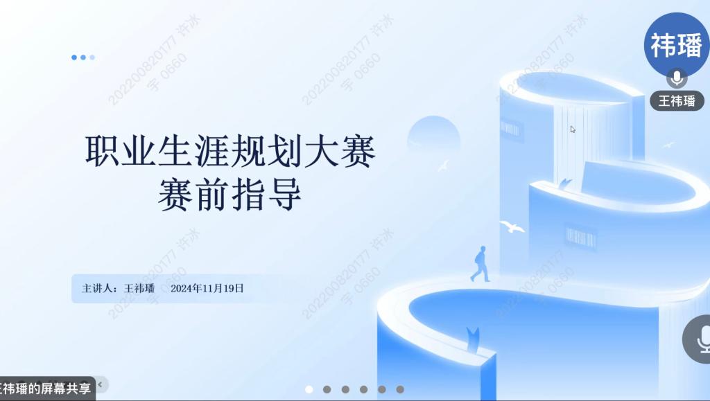 在学院初赛报名阶段,为帮助参赛同学充分了解比赛相关信息,切实提升学生职业规划能力,11月19日晚,学院“数与未来”生涯发展工作室成员王祎璠通过腾讯会议开展赛前指导,王祎璠以评分细则为切入点,就生涯发展报告的撰写、主题陈述的展示等进行了全面指导,鼓励学生“择己所长,择世所需”科学树立职业目标,挖掘内在发展潜力。经过广泛宣传动员,同学们踊跃报名,经过评委初审,最终筛选出成长赛道8名选手和就业赛道7名选手参加学院决赛。