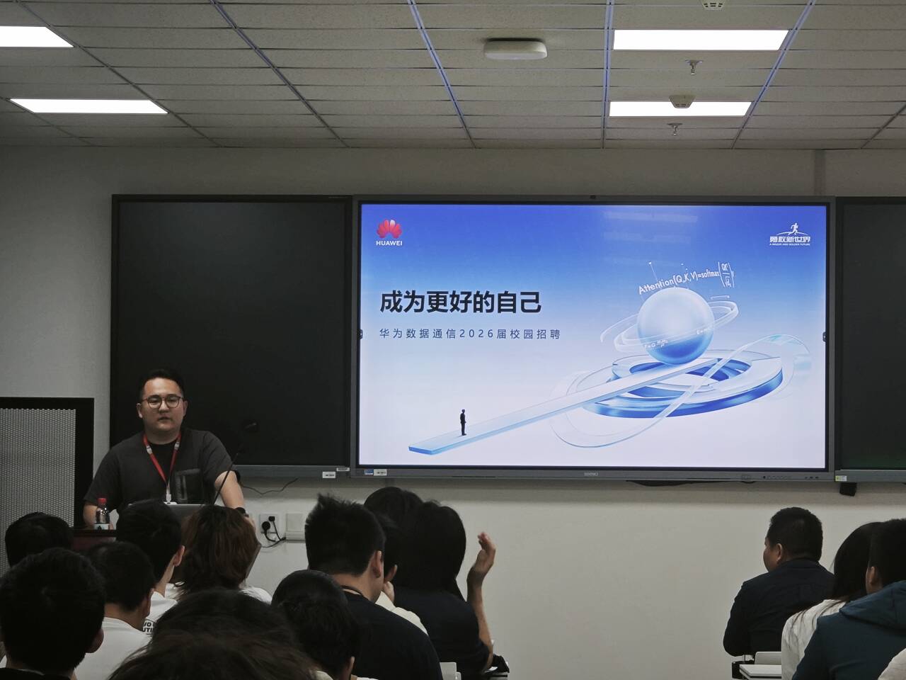 数据通信技术专家王锡森以多位华为天才少年的奋斗历程和多个工作中常见的算法问题为例,生动详细地解析了华为数通技术人才的招聘需求。他强调,扎实的数学基础、过硬的逻辑思维、系统的编程训练等是求职者顺利通关的法宝,同学们要不断提升专业能力,主动适应行业发展趋势。随后,数据通信路由器产品部项目经理管培国介绍了永利皇宫8858官网华为数通拔尖人才创新实践基地的建设过程和运行模式,深入剖析了实习基地各个岗位的能力要求,帮助同学们更直观地了解岗位职责与成长路径。最后,数据通信路由器招聘负责人许碧绿等详细讲解了华为的校招流程、选拔标准及实习基地培养机制,鼓励同学们结合自身优势,做好职业规划,精准定位未来方向。在互动环节,同学们就职业发展、技能提升和面试技巧等方面踊跃提问,嘉宾们一一耐心解答,现场气氛热烈。