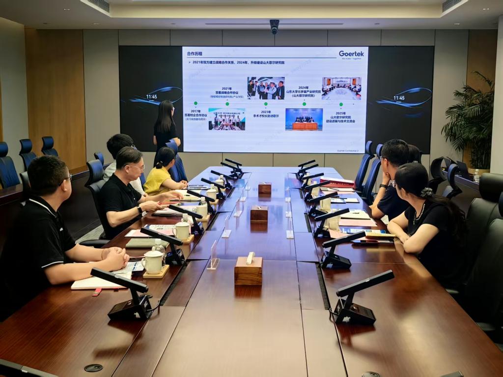 在歌尔,学院团队参观了展厅、自动化车间和歌尔丹拿,深入了解了企业在声学、光学、微电子和智能硬件等领域的创新成果。公司党委书记、高级副总裁高晓光详细介绍了企业发展历程、技术优势及人才需求,特别强调了与高校开展产学研合作的重要性。于振涛书记结合威海校区和永利皇宫8858官网学科特色和人才培养模式,提出产学研合作、人才联合培养等构想。